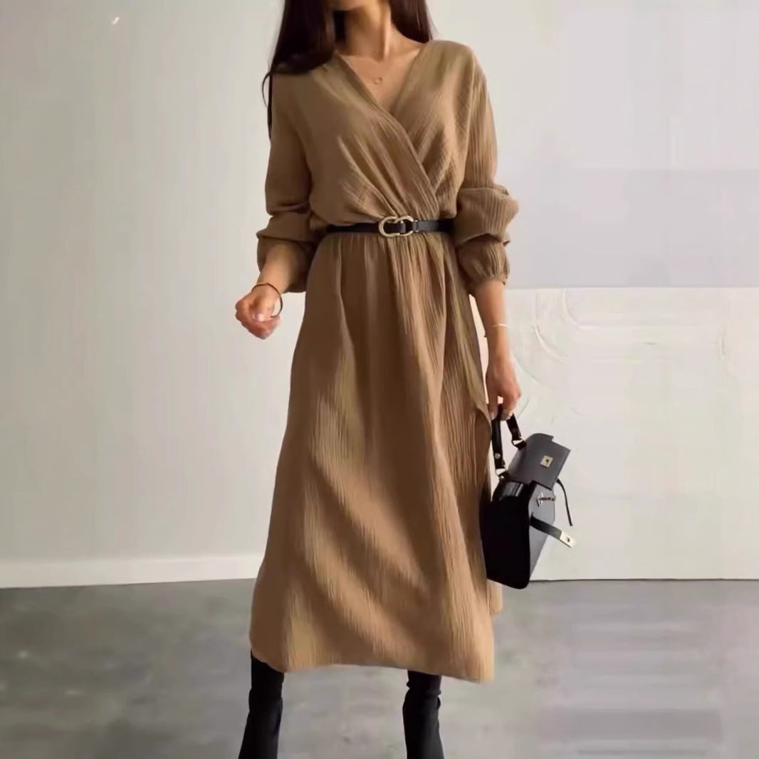 Women’s Long Sleeve Solid Color Dress with Waist Tie
